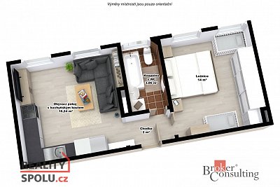 Dispozice bytu lze jednoduše upravit díky sádrokartonové příčce v ložnici oddělující pracovní kout. Posunutím by vznikl dostatečný prostor na vybudování i dětského pokoje.